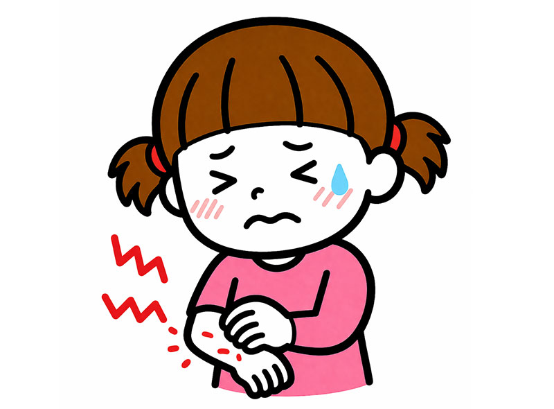 かゆみを伴う湿疹が繰り返しあらわれ、良くなったり悪くなったりを繰り返すのがアトピー性皮膚炎です。湿疹は左右対称に出ることが多く、年齢によって症状のあらわれ方も異なります。特に肌のバリア機能が低下しているお子さまや、アトピー体質をもつお子さまに多くみられるのが特徴です。肌が荒れると、そこから食べ物などの抗原が侵入し食物アレルギーなど他のアレルギー症状を誘発しやすくなります。そのため、アトピー性皮膚炎を適切に治療して皮膚をきれいに保つことは他のアレルギー疾患の予防にもつながると考えられています。